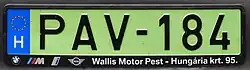 Les plaques d'immatriculation hongroises sont composées de 1 lettre « H » (Hongrie), suivies de 3 lettres puis de 3 chiffres (pouvant aller jusqu'à 9) écrits en noir sur fond blanc. Les plaques des véhicules électriques ou hybrides ont un fond vert.