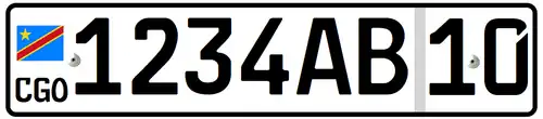 Les plaques d’immatriculation de la république démocratique du Congo sont de forme rectangulaire, les inscriptions y sont faites en noir sur blanc, portent le drapeau congolais, le sigle CGO et une identification composée de 4 chiffres, 2 lettres et 2 chiffres. Ce modèle est en application depuis et est construit exclusivement par Utsch Congo, filiale de la firme allemande Utsch AG (de) pour un contrat de 10 ans[1],[2].