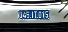 - Plaque d’immatriculation temporaire : blanc sur bleu foncé, 3 chiffres, le sigle IT, 3 chiffres
