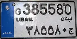 Les plaques d'immatriculation des véhicules libanais comportent le nom du pays, un nombre de trois à sept chiffres et une lettre repérant le centre immatriculateur.