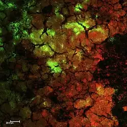 La plaque dentaire est un biofilm surtout composé de Streptococcus mutans, Streptococcus sobrinus et Lactobacillus spp (Selwitz, 2007), qui, en cas de déséquilibre écologique de l'« écosystème buccal », devient responsable de la plupart des maladies parodontales et de la carie dentaire[4]. Dans ce cas ce déséquilibre se fait entre la matière dentaire minérale et les biofilms bactériens de la cavité buccale et de la plaque dentaire. Ces bactéries sont protégées dans leur biofilm, mais en tant que corps étrangers à l'organisme - quand elles entrent en contact avec le sang ou les cellules immunitaires, elles activent normalement une défense immunitaire ; c'est la gingivite, qui peut évoluer en parodontite si la source de l'infection n'est pas traitée.
