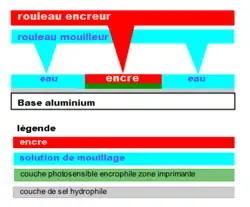 - la zone non-imprimante (ZNI), une surface non-imprimante recouverte d’une couche de silicate de sodium (sel) qui doit accepter l'eau (hydrophilie) et refuser l’encre grasse (lipophobie).