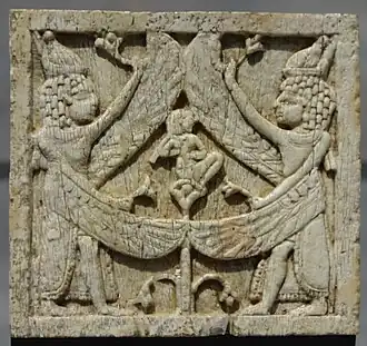 Plaque représentant une scène d'inspiration égyptienne est une plaquette presque de forme carrée en ivoire provenant d'Assyrie et datée de 800 à 700 av. J.-C.
