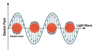 Un plasmon de surface localisé (LSP) est le résultat du confinement d'un plasmon de surface dans une nanoparticule de taille comparable ou inférieure à la longueur d'onde de la lumière utilisée pour exciter le plasmon. Lorsqu'une petite nanoparticule métallique sphérique est irradiée par la lumière, le champ électrique oscillant fait osciller de manière cohérente les électrons de conduction. Lorsque le nuage d'électrons est déplacé par rapport à sa position d'origine, une force de restauration résulte de l'attraction coulombienne entre les électrons et les noyaux. Cette force fait osciller le nuage d'électrons. La fréquence d'oscillation est déterminée par la densité d'électrons, la masse effective d'électrons, ainsi que la taille et la forme de la distribution de charge[1]. Le LSP a deux effets importants : les champs électriques près de la surface de la particule sont considérablement améliorés et l'absorption optique de la particule est maximale à la fréquence de résonance du plasmon. La résonance plasmon de surface peut également être réglée en fonction de la forme de la nanoparticule[1]. La fréquence du plasmon peut être liée à la constante diélectrique du métal[1]. L'amélioration diminue rapidement avec la distance de la surface et, pour les nanoparticules de métaux nobles, la résonance se produit aux longueurs d'onde visibles[2]. La résonance plasmonique de surface localisée crée des couleurs brillantes dans les solutions colloïdales métalliques[3].