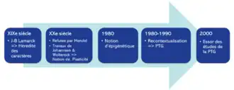 Les premières idées de transmissions des caractères acquis par un organisme à ses descendants apparaissent chez Jean-Baptiste Lamarck, au début du XIXe siècle, notamment à travers sa deuxième loi de l’hérédité des caractères acquis[2]. Selon cette loi, les variations du milieu induisent des transformations des organismes qui sont transmises sur de très nombreuses générations. Bien que cette idée ait été initialement influente et partagée en partie par Charles Darwin, elle a été réfutée au XXe siècle, notamment par la découverte des lois de l’hérédité de Mendel et la théorie de l’évolution de Charles Darwin, qui reposait sur la sélection naturelle et non sur l’hérédité des caractères acquis [2].