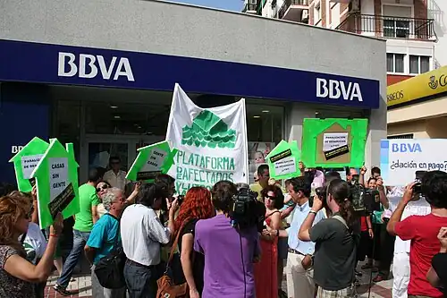 Depuis la crise économique de 2008-2012 l'augmentation du taux de chômage a dépassé les 20 % en Espagne, ce qui a placé des milliers de familles dans l'impossibilité de rembourser leur crédit hypothécaire. Depuis 2007, 350 000 familles se sont retrouvées sans logement, après avoir été expulsées de celui-ci, saisi par la banque en conséquence du non remboursement du crédit[12]. Les logements saisis sont ensuite vendus aux enchères, mais parfois à un prix inférieur à celui évalué pour le crédit hypothécaire contracté par les précédents propriétaires. Dans ce cas, la banque a le droit de leur réclamer la différence, s'estimant insuffisamment remboursée par la vente du logement[13].