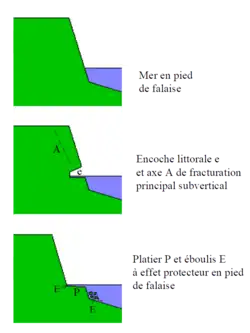 Les côtes à falaise précédées de platiers voient le recul de leur versant par éboulisation discontinue ou par mouvements de masse instantanés (écroulement, éboulement, glissement). Cette érosion littorale est traditionnellement imputée au travail de sape de la mer : les actions marines au pied de l'abrupt induisent au niveau de la zone de raccordement entre le platier et la falaise, la formation d'une encoche de sapement[c], ou des phénomènes de sous-cavage mettant en porte-à-faux l'escarpement sus-jacent. Les principaux agents d'érosion marine sont l'eau et les vagues qui altèrent les roches : l'altération physique ou mécanique résulte de la pression de l’eau des vagues pouvant atteindre 30 tonnes/m2 (celle de l’air comprimé injecté dans les fissures pouvant être encore plus forte), du phénomène de succion des vagues lorsqu’elles se retirent, du mitraillage né de la projection de sable, blocs et galets, et du phénomène de vibration induit par les vagues (à la suite de chocs successifs, la falaise entre en résonance et peut dépasser la limite de rupture) ; l'altération chimique provient essentiellement des embruns qui, en s’infiltrant, soumettent au lessivage les parois[6]. En réalité, le rôle des processus d'attaque marine dans le recul des falaises a souvent été surestimé. Ce recul résulte principalement de la dénudation des versants (rôles décisifs de la gélifraction, de la desquamation, de l'élargissement des diaclases par dissolution, de la pression hydrostatique de l'eau interstitielle issue du ruissellement et des infiltrations en haut de falaise, phénomène favorisé par les précipitations hivernales et les années pluvieuses)[7],[8]. Les nombreux travaux scientifiques sur ce sujet indiquent que le débat reste encore ouvert quant à la prépondérance d'un facteur par rapport à l'autre[9].