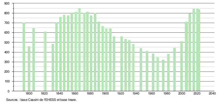 L'évolution du nombre d'habitants est connue à travers les recensements de la population effectués dans la commune depuis 1793. Pour les communes de moins de 10 000 habitants, une enquête de recensement portant sur toute la population est réalisée tous les cinq ans, les populations de référence des années intermédiaires étant quant à elles estimées par interpolation ou extrapolation[25]. Pour la commune, le premier recensement exhaustif entrant dans le cadre du nouveau dispositif a été réalisé en 2005[26].
