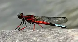 Les segments 1 à 5 sont rouges sur le dessus avec des marques noires réduites à une ligne étroite médiane discontinue avec une petite tache sur chaque côté de cette ligne dans la moitié distale. Sur le second segment la marque noire est en forme de "T" et les deux premiers segments présentent une courte ligne latérale noire. Le segment 6 est entièrement noir[3]. Les segments 7 à 10 sont bleus brillants sur le dessus et noirs sur le dessous[3]. Les appendices anaux sont noirs avec les cerques de forme conique[4].