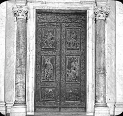 La scène de la remise miraculeuse du voile à Plautilla est représentée dans la porte de bronze centrale de la basilique Saint-Pierre-de-Rome (pas la porte sainte)[2],[3] Cette porte, la porte de Filarete, fut faite en 1445 par Le Filarète pour l'ancienne basilique et contient aussi scènes de la mythologie grecque et romaine comme l'enlèvement d'Europe et l'épisode de Dionysos et les pirates, qu'il transforme en dauphins[2]
