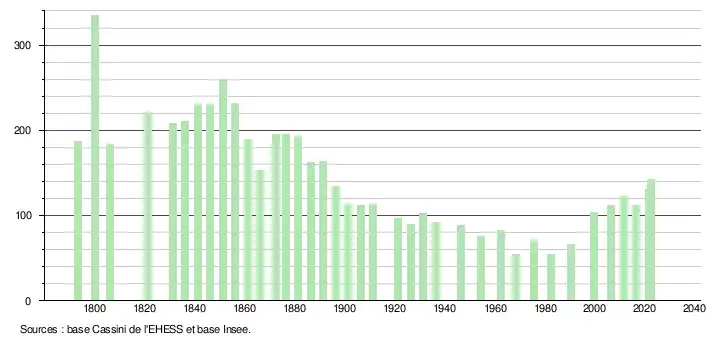 | L'évolution du nombre d'habitants est connue à travers les recensements de la population effectués dans la commune depuis 1793. Pour les communes de moins de 10 000 habitants, une enquête de recensement portant sur toute la population est réalisée tous les cinq ans, les populations de référence des années intermédiaires étant quant à elles estimées par interpolation ou extrapolation[21]. Pour la commune, le premier recensement exhaustif entrant dans le cadre du nouveau dispositif a été réalisé en 2006[22]. En 2022, la commune comptait 142 habitants[Note 3], en évolution de +26,79 % par rapport à 2016 (Aude : +2,65 %, France hors Mayotte : +2,11 %). |