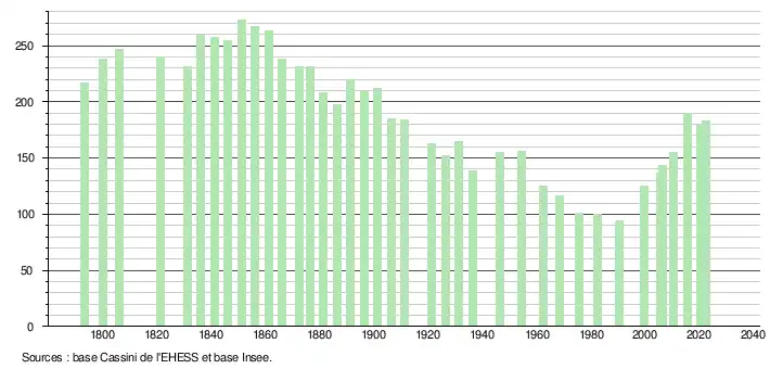 L'évolution du nombre d'habitants est connue à travers les recensements de la population effectués dans la commune depuis 1793. Pour les communes de moins de 10 000 habitants, une enquête de recensement portant sur toute la population est réalisée tous les cinq ans, les populations de référence des années intermédiaires étant quant à elles estimées par interpolation ou extrapolation[21]. Pour la commune, le premier recensement exhaustif entrant dans le cadre du nouveau dispositif a été réalisé en 2005[22].