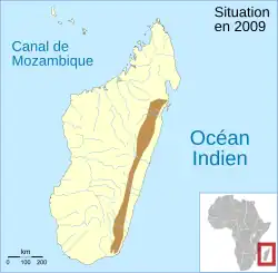 Cette espèce est endémique de l'Est de Madagascar. Elle se rencontre de la réserve spéciale d'Ambatovaky jusqu'au parc national d'Andohahela. Elle est présente du niveau de la mer jusqu'à 800 m d'altitude[1],[2].