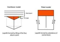 Les lopolites sont des masses intrusives lenticulaires concordantes qui présentent une forme convexe vers le bas, souvent sous forme de dépression dans le sol. Deux modèles ont été proposés pour expliquer la formation des lopolites : le modèle en porte-à-faux et le modèle à piston. Le modèle en porte-à-faux décrit la formation des lopolites par l'inclinaison du sol autour d'un point situé à la marge du pluton[5]. Dans le modèle en porte-à-faux, la formation des lopolites implique la déformation de la croûte sous-jacente par simple cisaillement, ce qui entraîne l'enfoncement de la fonte partielle. En revanche, dans le modèle à piston, la genèse des lopolites commence lorsque le plancher du bloc central s'enfonce[5]. Ce processus se poursuit avec l'épaississement du sol, créant ainsi des lopolites de forme tabulaire[32].