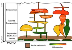 Un diapir se forme lorsqu'une boule de matière, une goutte chaude et ductile, remonte vers une couche lithosphérique supérieure[13]. Le diapirisme est considéré comme le principal mécanisme de transport du magma dans la croûte inférieure à moyenne et c'est l'un des mécanismes de transport viables pour les magmas felsiques et mafiques[13].