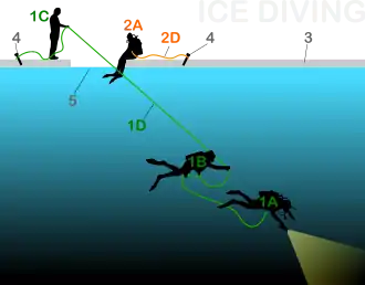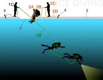 1 = équipe de plongée actuelle (1A = premier plongeur au bout de la corde; 1B = deuxième plongeur et cordiste; 1C = tender; 1D = première corde de guidage [verte] pour la communication, l'orientation et le sauvetage, ~50-100m de long.)