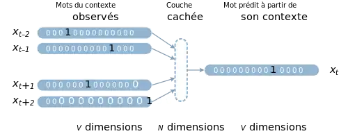 Dans les deux cas, on définit un réseau de neurones artificiels qui a une couche d'entrée , et une couche de sortie . Ces vecteurs sont binaires et de taille . Une couche cachée à dimensions est intercalée entre les deux. est un hyperparamètre d'apprentissage. L'entraînement du réseau produit une matrice de taille , connectée à gauche aux entrées et à droite à la couche cachée. Au terme de l'apprentissage, la matrice contient les plongements de tous les mots du vocabulaire.