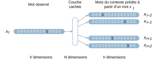 Le modèle skip-gram[9] apprend en considérant un mot tiré d'une phrase donnée. Autrement dit pour entraîner le réseau de neurones nous considérons une phrase , on en extrait un mot qui sera notre entrée du réseau . Le reste de la phrase sera notre sortie .