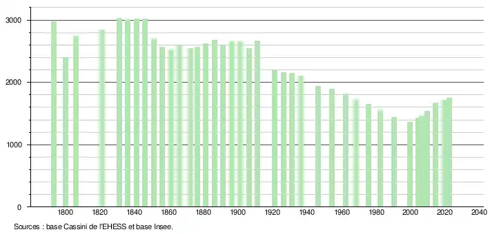 L'évolution du nombre d'habitants est connue à travers les recensements de la population effectués dans la commune depuis 1793. Pour les communes de moins de 10 000 habitants, une enquête de recensement portant sur toute la population est réalisée tous les cinq ans, les populations de référence des années intermédiaires étant quant à elles estimées par interpolation ou extrapolation[20]. Pour la commune, le premier recensement exhaustif entrant dans le cadre du nouveau dispositif a été réalisé en 2004[21].