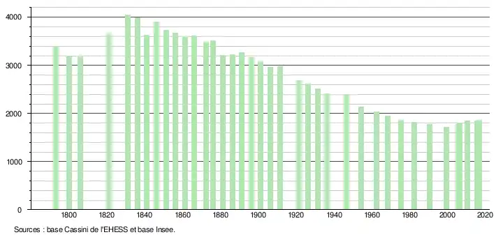 L'évolution du nombre d'habitants est connue à travers les recensements de la population effectués dans la commune depuis 1793. Pour les communes de moins de 10 000 habitants, une enquête de recensement portant sur toute la population est réalisée tous les cinq ans, les populations de référence des années intermédiaires étant quant à elles estimées par interpolation ou extrapolation[9]. Pour la commune, le premier recensement exhaustif entrant dans le cadre du nouveau dispositif a été réalisé en 2005[10].