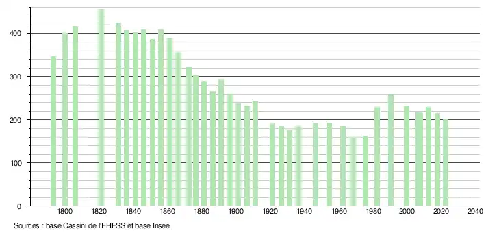 L'évolution du nombre d'habitants est connue à travers les recensements de la population effectués dans la commune depuis 1793. Pour les communes de moins de 10 000 habitants, une enquête de recensement portant sur toute la population est réalisée tous les cinq ans, les populations de référence des années intermédiaires étant quant à elles estimées par interpolation ou extrapolation[32]. Pour la commune, le premier recensement exhaustif entrant dans le cadre du nouveau dispositif a été réalisé en 2007[33].