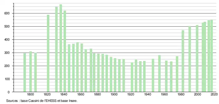 L'évolution du nombre d'habitants est connue à travers les recensements de la population effectués dans la commune depuis 1793. Pour les communes de moins de 10 000 habitants, une enquête de recensement portant sur toute la population est réalisée tous les cinq ans, les populations de référence des années intermédiaires étant quant à elles estimées par interpolation ou extrapolation[2]. Pour la commune, le premier recensement exhaustif entrant dans le cadre du nouveau dispositif a été réalisé en 2008[3].
