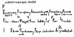 - Dickins (1916) donne l'interprétation suivante (en cursif les lettres rajoutées à la suite d'une interprétation d'un défaut dans le parchemin)[8]: