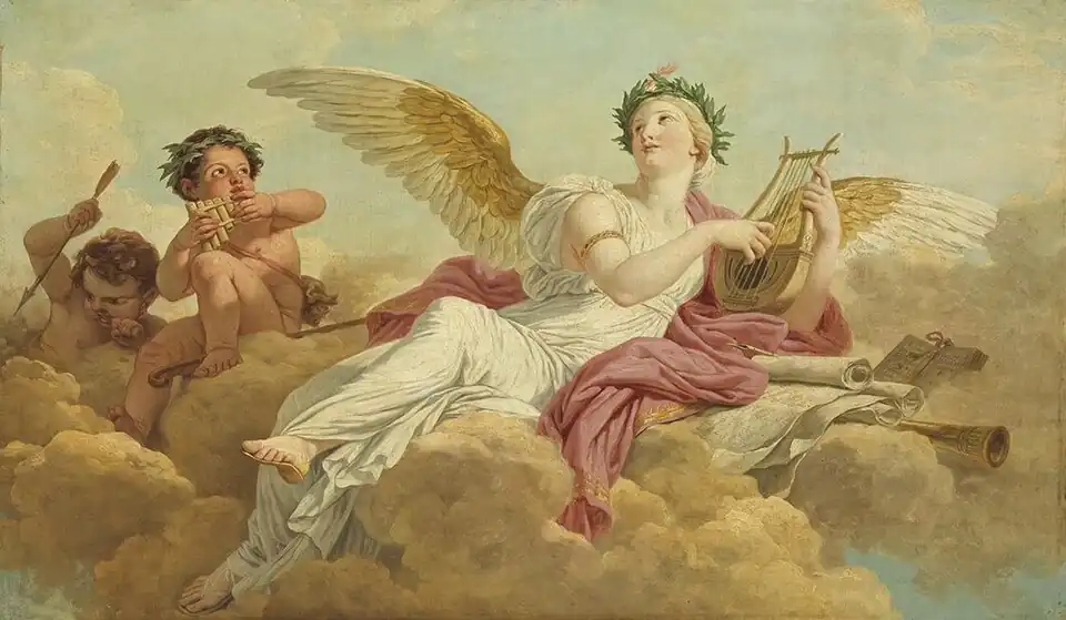 Placées sous l’égide d’Orphée et d’Apollon musagète, dieu de la beauté et des arts[3], et associées à la muse Érato, musique et poésie sont également étroitement liées par la recherche de l’harmonie et de la beauté, par le Charme, au sens fort de chant magique. Depuis l'essai La Naissance de la tragédie de Nietzsche, on considère que la création poétique hésitera cependant constamment entre l’ordre et l’apaisement apolliniens (qu’explicite Euripide dans Alceste : « Ce qui est sauvage, plein de désordre et de querelle, la lyre d’Apollon l’adoucit et l’apaise ») et la « fureur dionysiaque »[4] qui renvoie au dieu des extases, des mystères, des dérèglements et des rythmes des forces naturelles que l’on découvre par exemple dans le dithyrambe de l’Antiquité grecque[5].