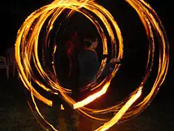 Pour les cordes de feu, deux cordes de kevlar remplacent la chaîne et le poids. Les poïs sont alors entièrement enflammés. Il faut garder une distance de sécurité en chaîne entre la prise et le début de la corde pour éviter les brûlures.
