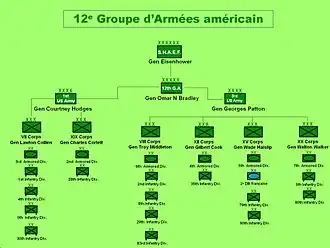 Le 12e groupe d'armées du général Omar Bradley est organisé en deux armées de la même manière : la 1re armée américaine du général Courtney Hodges à deux corps d'armée et la 3e armée américaine du général George Patton à quatre corps d'armée. Les Américains disposent ainsi de 21 divisions, dont 6 blindées, y compris la 2e division blindée française du général Leclerc, soit 320 000 hommes et plus de 2 000 blindés.
