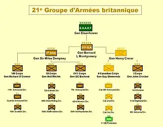 Depuis la réorganisation d'août, le 21e groupe d'armées du général Montgomery est organisé en deux armées distinctes : la 2e armée britannique du général Miles Dempsey et la 1re armée canadienne du général Harry Crerar. L'armée britannique est forte de trois corps d'armée à trois divisions chacune. L'armée canadienne est constituée de deux corps d'armée. Ces forces totalisent 16 divisions, dont cinq blindées, soit 240 000 hommes et 1 500 blindés[18]. Ce début du mois d'août voit l'engagement de la 1re division blindée polonaise du général Maczek, débarquée récemment, le .