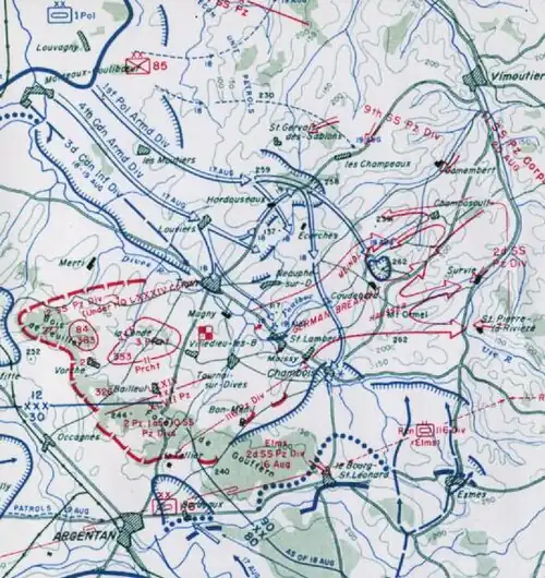 Considérant que l'ennemi est très faible entre la Dives et la Seine, et qu'une bonne partie des Allemands a réussi à s'enfuir[46], il souhaite consacrer une part du XVe corps américain à une progression plein est avec Dreux pour objectif primaire.