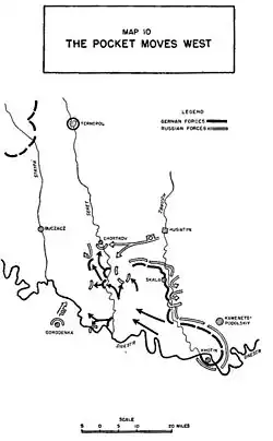 Alors que l'armée de Hube s'échappe à l'ouest, Joukov et Koniev restent incertains des intentions allemandes, pensant toujours que les Allemands tenteront de rompre l'encerclement par le sud. Les Soviétiques lancent alors des attaques depuis l'est et le nord mais tombent dans de nombreux cas sur des positions qui avaient déjà été abandonnées par l'arrière-garde allemande qui s'était retirée à Proskourov. Et malgré les attaques à l'ouest, l'Armée rouge continue d'augmenter la densité de ses troupes sur le flanc sud de la poche, en prévision d'une attaque qui ne viendra jamais.