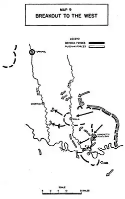 Le , alors que Joukov envoie un ultimatum aux Allemands leur demandant de déposer les armes et qu'Hitler, craignant de perdre entièrement une panzerarmee, donne finalement l'ordre de retraite à Hube, celui-ci regroupe ses forces et termine tous les préparatifs pour la poussée vers la rivière Zbroutch (son plan étant de s'échapper au nord-ouest de Ternopil et de faire jonction avec les forces de secours de Paul Hausser qui doivent assurer leur relève). L'avant-garde de la 1re Panzerarmee se lance vers l'ouest. La menace d'une panique parmi ses troupes étant une grave préoccupation, Hube consolide ses forces dans des groupes de corps provisoires afin de maintenir le contrôle et simplifier la chaîne de commandement : chaque groupe de corps, dans son secteur, doit être responsable à la fois de la conduite de l'attaque à l'ouest et de la protection de l'arrière à l'est. Les divisions blindées de chaque groupe de corps constituent le fer de lance de cette attaque, tandis que les divisions d'infanterie couvrent les arrières.