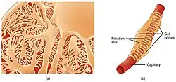 La liaison entre les podocytes et la membrane basale est assurée par des intégrines se fixant sur une laminine de la membrane, une altération de l'un de ces deux éléments pouvant conduire à un syndrome néphrotique[1]. Les intégrines podocytaires sont reliées également au cytosquelette de la cellule par de la TLN1 (taline - 1) dont le déficit peut également conduire à une fuite protéique dans les urines[2].
