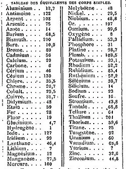 Un problème beaucoup plus grave est posé par les éléments qui forment plus qu'un oxyde ou série des sels avec différents états d'oxydation (comme ils s'appellent aujourd'hui). Le cuivre par exemple réagit avec l'oxygène pour former soit l'oxyde cuivreux rouge brique (l'oxyde de cuivre(I), avec 63,5 g de cuivre pour 8 g d'oxygène), soit l'oxyde cuivrique noir (l'oxyde de cuivre(II), avec 32,7 g de cuivre pour 8 g d'oxygène), et alors il y a deux valeurs du poids équivalent. Les adhérents des poids atomiques peuvent se baser sur la loi de Dulong et Petit (1819) qui relie le poids atomique d'un élément solide à sa capacité thermique, pour arriver à un ensemble des poids atomiques qui est unique et sans équivoque. Avant 1860 la grande majorité des chimistes sont adhérents des poids équivalents qu'ils supposaient plus fondamentaux que les poids atomiques, et ils ne se préoccupent pas de l'existence des valeurs multiples des poids équivalents pour la plupart des éléments. En effet ces chimistes sont convenus de lister des « équivalents supposés » : H = 1, O = 8, C = 6, S = 16, Cl = 35,5, Na = 23, Ca = 20, etc. Cependant ces « équivalents » du XIXe siècle ne sont équivalents ni au sens originel ni au sens moderne du terme. Étant donné qu'ils représentent des nombres sans dimension qui sont uniques et invariants pour chaque élément, ils sont en effet un ensemble alternatif des poids atomiques, auquel les éléments de valence pair (O, C, Ca, etc.) ont des poids atomiques égaux à la moitié des valeurs modernes. Ce fait n'est pas reconnu jusqu'à beaucoup plus tard[4].