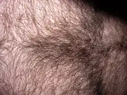 - Interaction entre poil et peau : la maladie pilonidale (du latin : pilus : poil et nidus : nid) est une affection bénigne et fréquente. Le terme kyste sacrococcygien, longtemps utilisé, paraît aujourd'hui inapproprié[23] ; les poils incarnés sont fréquents après le rasage ou l'épilation et visibles à la surface de la peau, ils émergent de leur follicule mais continuent de pousser sous la peau déviant donc de leur trajet normal (hors de la peau). Ils sont généralement cause d'inflammation voire d'infection : folliculite, abcès, etc.
