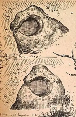 - ↑ présidence d'Émile Rivière, « Séance du 12 octobre 1904 », Bulletins de la Société préhistorique française, Société préhistorique française, , p. 257-271 (lire en ligne), intervention d'Émile Rivière « Sur les pierres à cupules », pp. 169-171.