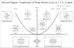 Un point d'équilibre est hyperbolique si aucune des valeurs propres n'a de partie réelle nulle. Si toutes les valeurs propres ont des parties réelles négatives, le point est stable . Si au moins une des parties réelles est positive, le point est instable . Si au moins une des valeurs propres a une partie réelle négative et au moins une a une partie réelle positive, l'équilibre est un point col et il est instable. Si toutes les valeurs propres sont réelles et ont le même signe, le point est appelé un nœud.