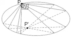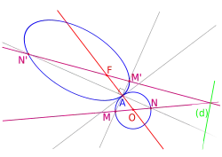 Théorème — Soit une conique et M un point de cette conique. Toutes les cordes de la conique vues sous un angle droit depuis M sont sécantes en un même point F.