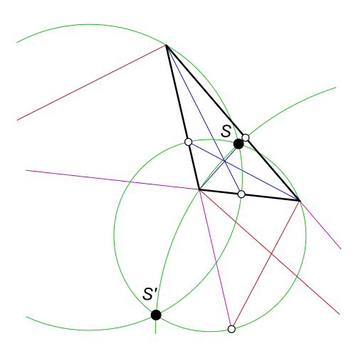 Les points S et S' sont les points d'intersection des trois cercles d'Apollonius associés au triangle ABC, les trois cercles passant par un sommet du triangle et maintenant un rapport de distances constant aux autres sommets[4],[5]. Ainsi, la droite SS' est l'axe radical des trois paires de cercles d'Apollonius. La médiatrice du segment [SS'] est la droite de Lemoine du triangle, qui passe par les centres des cercles d'Apollonius[6].