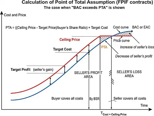 Le vendeur assume tous les risques de coût à partir de ce point PTA, puisque chaque euro de surcoût se traduit par une baisse de un euro de la marge bénéficiaire. Et que dès que le coût dépasse ce PTA, le montant maximum que l'acheteur paie est le prix plafond.
