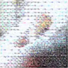 Zoom sur les points produits par une imprimante à jet d'encre pour une qualité « brouillon ». La taille réelle est d’environ 0,64 × 0,64 cm. Les points de couleurs sont visibles sur cette impression à 150 DPI.