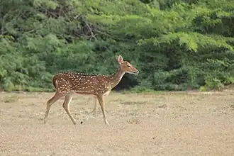 Une biche axis à découvert. Les milieux ouverts sont menacés par les plantes invasives de type Prosopis juliflora.