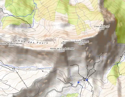 La pointe de Grande Combe est voisine d'un autre sommet situé juste au nord et dépourvu de toponyme bien qu'il culmine à une altitude légèrement supérieure avec 2 223 mètres[1]. Ces deux pointes marquent le rebord oriental de la combe des Fours qui s'étire sur le flanc Nord de la montagne[1]. Le sommet de la pointe de Grande Combe n'est pas accessible bien qu'un sentier de randonnée menant à la pointe d'Almet emprunte la combe des Fours à l'ouest[1].