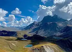 La pointe du Vallonnet à gauche et le Grand roc Noir à droite vus depuis le vallon de la Leisse le nord-ouest en . | |||