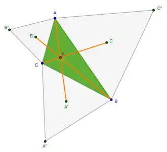 Soit ABC un triangle plan. On construit à partir des côtés BC, CA, AB, les triangles équilatéraux extérieurs A"BC, B"CA et C"AB respectivement. On note les centres de gravité de ces triangles A', B' et C' respectivement. Alors A'A, B'B et C'C sont concourantes au point noté K, qui est le premier point de Napoléon, ou point de Napoléon extérieur, du triangle ABC.