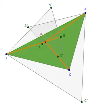 Soit ABC un triangle plan. On construit à partir des côtés BC, CA, AB, les triangles équilatéraux intérieurs A"BC, B"CA et C"AB respectivement. On note les centres de gravité de ces triangles A', B' et C' respectivement. Alors A'A, B'B et C'C sont concourantes au point noté K, qui est le second point de Napoléon, ou point de Napoléon intérieur, du triangle ABC.