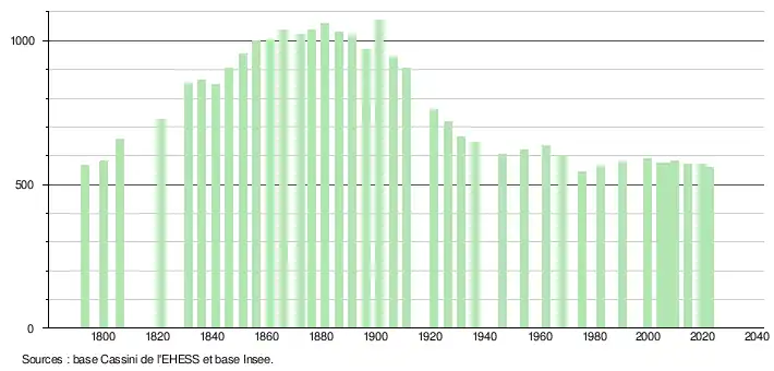 L'évolution du nombre d'habitants est connue à travers les recensements de la population effectués dans la commune depuis 1793. Pour les communes de moins de 10 000 habitants, une enquête de recensement portant sur toute la population est réalisée tous les cinq ans, les populations de référence des années intermédiaires étant quant à elles estimées par interpolation ou extrapolation[14]. Pour la commune, le premier recensement exhaustif entrant dans le cadre du nouveau dispositif a été réalisé en 2004[15].