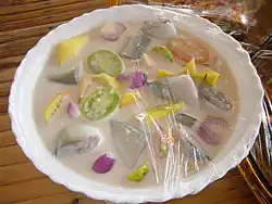 - Aux Philippines, le kinilaw est préparé à partir de la chair de différents poissons (maquereau, thazard noir, espadon…), en utilisant du vinaigre (de noix de coco ou de canne à sucre) ou du jus de citron.